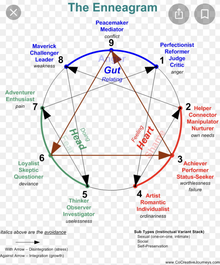 Recently I took a test to figure out my Enneagram type, which I now understand is loosely based on both Meyers-Briggs and Strength Finders. The nine (9) Enneagram types, which are organized in a circle like this picture, have underlying physical and emotional components: