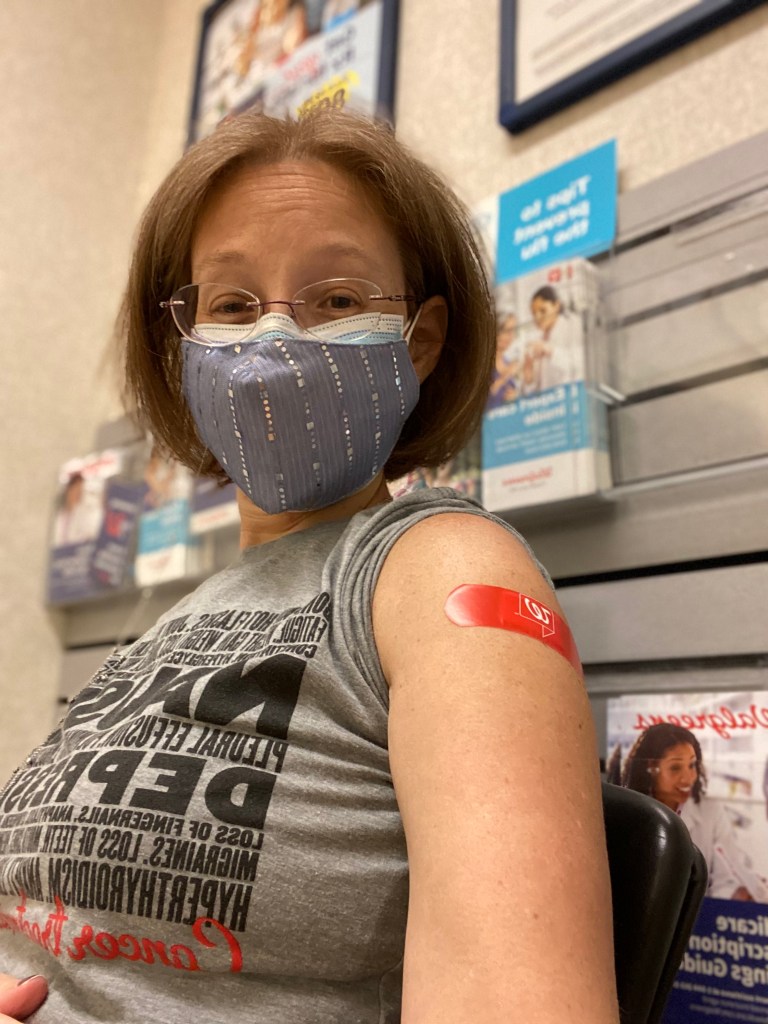 And so, off I went to a local retail pharmacy to get my booster shot since my cancer center doesn’t have them as of yet. I was armed with the boxes of the medication that reduces my immune system and a doctor’s note that clearly demonstrates my diagnosis of Stage IV Metastatic Breast Cancer (MBC) from 2017 along with a copy of the report of a recent PET scan in case they questioned whether the diagnosis was ongoing. When I called ahead to find out what I needed to show that I qualified to get the booster, I’d gotten several different answers, so I figured I’d better be over-prepared.