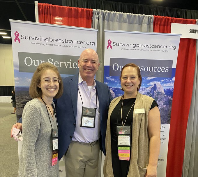Throughout the day and in between meetings and sessions, Laura and I rotated back and forth from the SBC table, where her mom, Carol, has spent most of the conference. We had the pleasure of talking with patient advocates, doctors, researchers, other exhibitors, etc., all about the services we offer. During one such time at the table, we had the pleasure of spending some time with Gary Thompson, proud dad of Kyle Thompson, who has brought #pinkkids to SurvivingBreastCancer.org. Meeting people for the first time in real life when you’ve “known” them for a bit online is an odd experience that I think I’ve just gotten used to because it happens so often at these conferences. We took a picture to memorialize the meeting, of course.