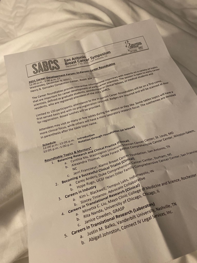 The second day of SABCS 2021 was quite a whirlwind and I’m still adjusting to the level of activity and brain/focus requirements. Getting a good night’s sleep after the intense day on Tuesday was key and my roommate, the amazing Laura Carfang, of SurvivingBreastCancer.org, left me to snooze while she headed off to the early poster session this morning. I attended some of the sessions through Alamo Breast Cancer Foundation while continuing to be cozy in my bed and then headed over to the convention center for the day.