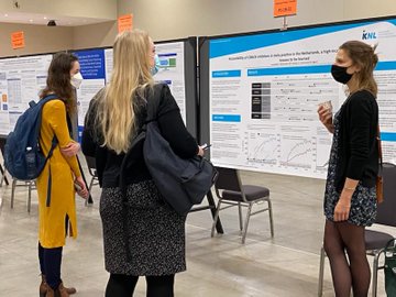 A poster session is literally a big room filled with these huge posters explaining something. Some of the posters have pictures, some don’t and some have the font set so small that one must get pretty close to the actual paper to read it; it’s a challenge to get all that the authors want/need to say included. The posters are usually printed on paper, but sometimes other media. The poster author or someone who understands the research will stand next to the poster during the designated poster sessions and explain what it shows. Here are some pictures from poster sessions so you can get a sense of what it is like — the ones from this year are where people are wearing masks!
