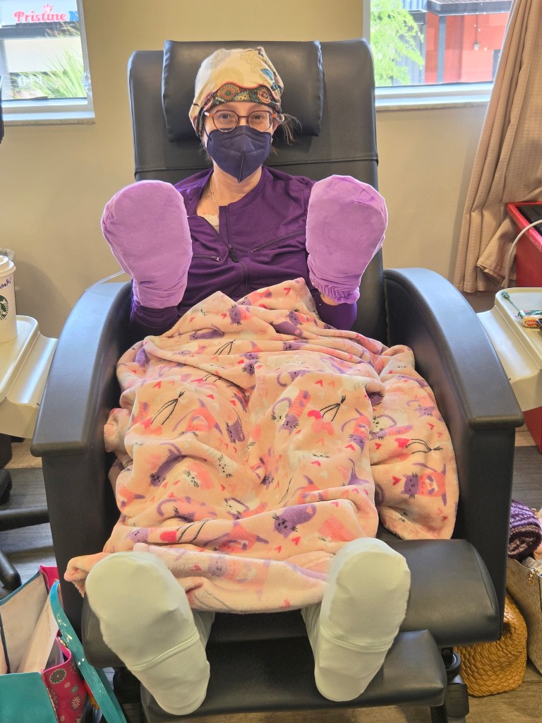 After weighing all of the factors and making my rounds to all of my consulting doctors, I chose to do Taxol, three weeks on and one week off to start. I’m using both compression and ice packs on my hands and feet to hopefully avoid peripheral neuropathy (recent results of the POLAR study showing compression and icing are helpful: https://jamanetwork.com/journals/jamaoncology/fullarticle/2830876#google_vignette). The actual time in the infusion chair has been pretty closet to two (2) hours each time, which is substantially better than previous infusion lines and my new infusion center has been so very efficient both times and it’s much closer to my house, so I’m thankful that I made the change, even if it was a pretty complicated time to do so.